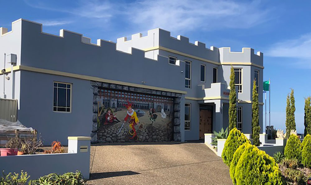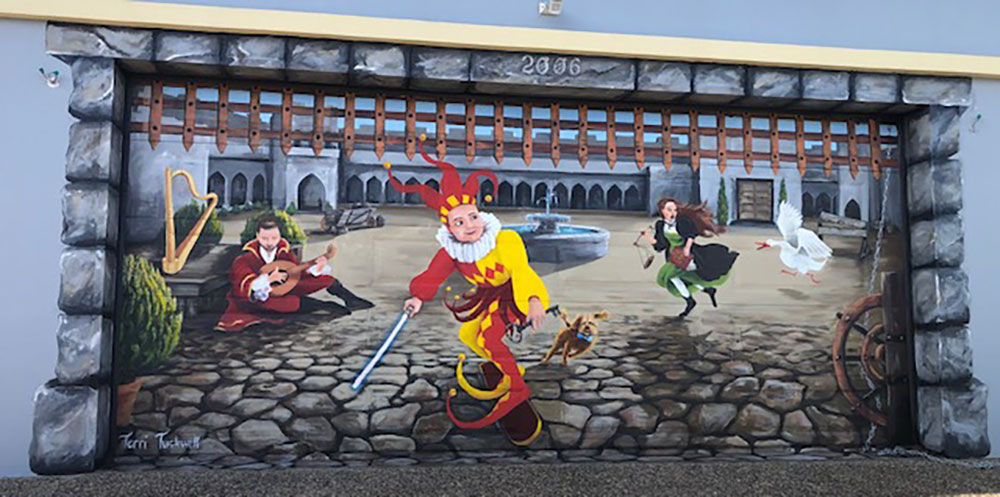 Another of Terri's fabulous murals is on a garage door of a house called ''The Castle'' in Dolphin Cove, Tura Beach.